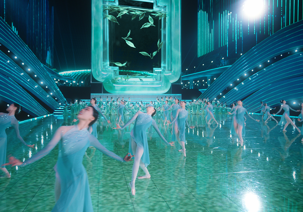 主舞台的造型别具匠心,以蓝色波浪为基底,既象征浙江“勇立潮头”的姿态,也暗合“七山二水一分田”的地貌。舞台之上,芭蕾舞者立于“钱江潮头”,足尖轻点,勾勒出江水奔涌交汇的轨迹。