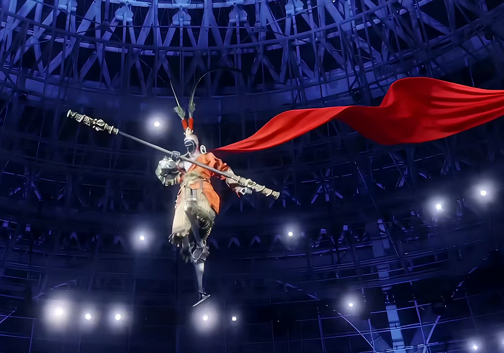 当“浙江新特产”五个字霸屏,超现实的视觉奇观上演,身披《黑神话:悟空》战袍的宇树机器人,脚踏机器狗(筋斗云造型)穿行街市,与义乌市场的无人机、智能装备相映成趣。