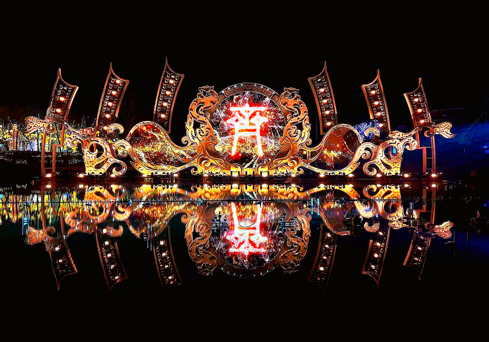 《泱泱齐风》以“封齐之问”开篇,在数虎图像的视觉创制下,星轨流转、城邑生长,姜太公立国建制的历史场景在湖面铺展。