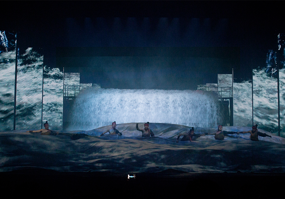 《桂林千古情》中数十名特技演员利用威亚上天入地,再现了当年开凿灵渠的艰险与秦军的无畏。数十米高、3000吨的洪水瞬间倾泻而下,无比震撼。