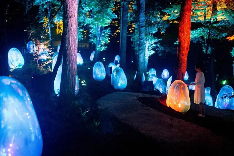 teamLab此次用光影装置艺术,将武藏野的橡子森林变成美妙的互动艺术空间。