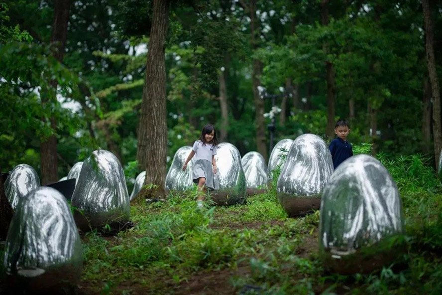 森林里分布着能反光的大“橡果”,白天,它将周围的世界映射在其中,像是调皮的“不倒翁”,当被推或者被风吹倒,会自己站立,并且散发出不同的光色与声音。整片森林被逐层呼应,发出空灵的音色与游客互动交流。