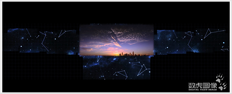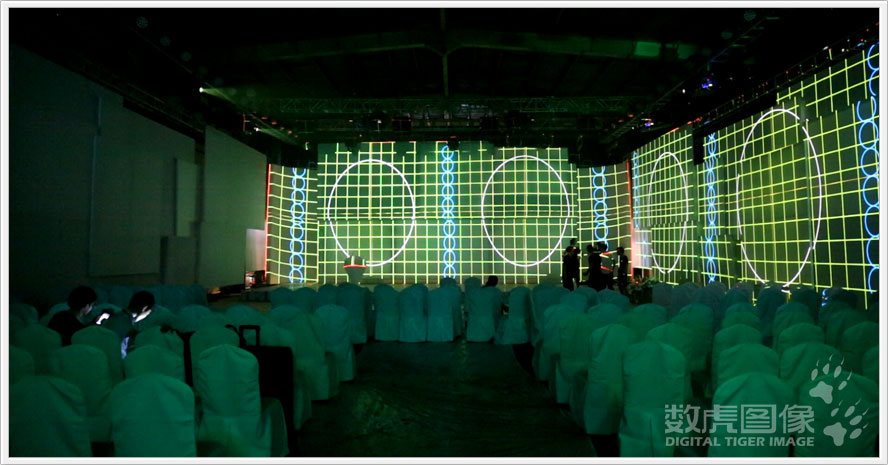 开幕式现场搭建了多层结构的投影幕,通过13台20000流明投影机,投影呈现一个半包裹式舞台视觉框架。